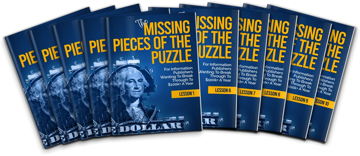 Now, I know you’re excited, but before you order there’s one thing I want you to understand: The purpose of The Missing Pieces Of The Puzzle For Information Publishers is to help you get a workable plan in place to start or quickly solve the puzzle about how to scale your information publishing business to a level of $100k a year of more.